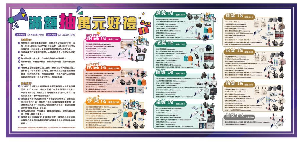 - 2026年2月1日15:55為最後投入摸彩券時間,抽獎時間為當日16:00,並於二日內於官網公告及簡訊通知中獎者。中獎者需於2月13日前置工商時報南區管理中心領獎,逾期視為放棄,恕不補發或寄送。